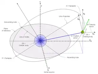 In astrodynamics and celestial dynamics, the orbital state vectors (sometimes state vectors) of an orbit are Cartesian vectors of position () and velocity () that together with their time (epoch) () uniquely determine the trajectory of the orbiting body in space.[1]: 154
