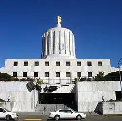 The Oregon Apollo 11 lunar sample display is exhibited in the governor's ceremonial office at the Oregon State Capitol.[1]