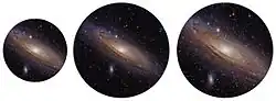 - ↑ A common simple way to directly measure the true field of view, (if there is no vignetting by the telescope's tube wall) is to clock the time it takes a star sitting within a few degrees of the celestial equator to drift across the entire field of view of the eyepiece, with the telescope sitting still. That time is a (nearly) exact measure of the field of view, in clock seconds, and converts to units of angular degrees via More accurate formulas can correct for any height of the star above or below the equator, and hence dispense with the need to use an equator-hugging star.