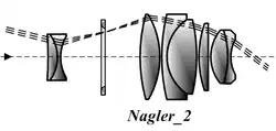 Invented by Albert Nagler and patented in 1979, the Nagler eyepiece is a design optimized for astronomical telescopes to give an ultra-wide field of view (82°) that has good correction for astigmatism and other aberrations. Introduced in 2007, the Ethos is an enhanced ultra-wide field design developed principally by Paul Dellechiaie under Albert Nagler's guidance at Tele Vue Optics and claims a 100–110° AFOV.[17][18] This is achieved using exotic high-index glass and up to eight optical elements in four or five groups; there are several similar designs called the Nagler, Nagler type 2, Nagler type 4, Nagler type 5, and Nagler type 6. The newer Delos design is a modified Ethos design with a FOV of 'only' 72 degrees but with a long 20 mm eye relief.