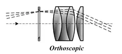 The 4-element orthoscopic eyepiece consists of a plano-convex singlet eye lens and a cemented convex-convex triplet field lens achromatic field lens. This gives the eyepiece a nearly perfect image quality and good eye relief, but a narrow apparent field of view — about 40°–45°. It was invented by Ernst Abbe in 1880.[3] It is called "orthoscopic" or "orthographic" because of its low degree of distortion and is also sometimes called an "ortho" or "Abbe".