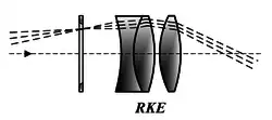 An RKE eyepiece has an achromatic field lens and double convex eye lens, a reversed adaptation of the Kellner eyepiece, with its lens layout similar to the König. It was designed by Dr. David Rank for the Edmund Scientific Corporation, who marketed it throughout the late 1960s and early 1970s. This design provides slightly wider field of view than classic Kellner design and makes its design similar to a widely spaced version of the König.