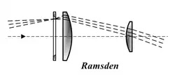 The Ramsden eyepiece comprises two plano-convex lenses of the same glass and similar focal lengths, placed less than one eye-lens focal length apart, a design created by astronomical and scientific instrument maker Jesse Ramsden in 1782. The lens separation varies between different designs, but is typically somewhere between 7 /10 and 7 /8 of the focal length of the eye-lens, the choice being a trade off between residual transverse chromatic aberration (at low values) and at high values running the risk of the field lens touching the focal plane when used by an observer who works with a close virtual image such as a myopic observer, or a young person whose accommodation is able to cope with a close virtual image (this is a serious problem when used with a micrometer as it can result in damage to the instrument).