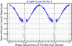 Ou 5 showed signs of variability during the three occasions when IPHAS observed it. Because of that, members of the IPHAS team made follow-up photometric observations of the nebula during October and November 2013, using the 80 cm IAC80 telescope at the Teide Observatory. The derived light curve showed that the central star was an eclipsing binary, and the short orbital period (8.7 hours) implies that during the red giant phase which preceded the formation of the planetary nebula, the stars must have formed a common envelope binary.[1] Passing through a common envelope stage is often invoked as an explanation for the bipolar shape seen in many planetary nebulae,[7] and Ou 5 does have bipolar features. The structure of the barrel-shaped nebula[2] suggests that there may have been multiple mass ejection events during the common envelope phase.[1]