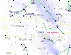 ![]() Vulpecula constellation, with the position of PSR B1937+21 marked in red. | |