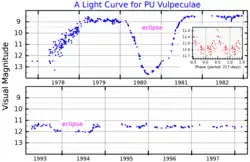![]() A visual band light curve for PU Vulpeculae, adapted from Belyakina et al.,[1] Kolotilov & Belyakina,[2] and Chochol et al..[3] The main plots show the long-term variability, and the inset plot within the upper panel shows the Mira pulsations. | |
