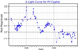 PV Cephei is a variable star of Orion type located in the constellation of Cepheus at a distance of about 1,100 light-years from Earth.[9] In visible light it varies in brightness from magnitude 17 to 19, making it far too faint to be seen by the naked eye.[10]