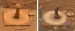 The calibration target on the rover is also part of the camera system and contains several areas. Polished areas to reflect the Martian sky, areas with known reflectivity and at the four corners color targets made from silicone. The inorganic pigments for the corners were hematite, goethite, chromium oxide and cobalt aluminate.[5] The calibration target is part of the sundial assembly.