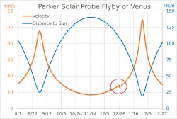 This article incorporates text from this source, which is in the public domain. - ↑ "Parker Solar Probe Heads Toward Second Venus Flyby". Parker Solar Probe News Center. Johns Hopkins University Applied Physics Laboratory. November 20, 2018. Archived from the original on December 26, 2019. Retrieved December 23, 2019. Gives the time as "1:14 p.m. EST" and the distance of the flyby as "within 1870 miles".