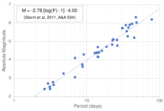 - ↑ Storm, J.; Gieren, W.; Fouqué, P.; Barnes, T. G.; Pietrzyński, G.; Nardetto, N.; Weber, M.; Granzer, T.; Strassmeier, K. G. (October 2011). "Calibrating the Cepheid period-luminosity relation from the infrared surface brightness technique: I. The p-factor, the Milky Way relations, and a universal K-band relation". Astronomy & Astrophysics. 534. EDP Sciences: A94. arXiv:1109.2017. Bibcode:2011A&A...534A..94S. doi:10.1051/0004-6361/201117155. S2CID 96456751.