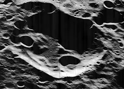 This is a worn and eroded crater formation with an outer rim that has been reshaped by several subsequent impacts. Laid along the inner wall to the east-northeast is a small crater. Small craterlets lie along the southern inner wall and the northwestern rim. Several smaller craterlets cut across the rim along the southwest and north.