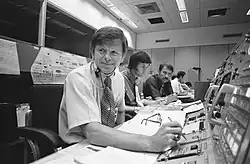 ![]() M. P. Frank (foreground), in the Mission Operations Control Room during the Apollo-Soyuz Test Project | |