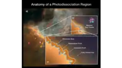 In astrophysics, photodissociation regions (or photon-dominated regions, PDRs) are predominantly neutral regions of the interstellar medium in which far ultraviolet photons strongly influence the gas chemistry and act as the most important source of heat.[2] They constitute a sort of shell around sources of far-UV photons at a distance where the interstellar gas is dense enough, and the flux from the photon source is no longer strong enough, to strip electrons from the neutral constituent atoms.[3] Despite being composed of denser gas, PDRs still have too low a column density to prevent the penetration of far-UV photons from distant, massive stars. PDRs are also composed of a cold molecular zone that has the potential for star formation.[4] They achieve this cooling by far-infrared fine line emissions of neutral oxygen and ionized carbon.[5] It is theorized that PDRs are able to maintain their shape by trapped magnetic fields originating from the far-UV source.[6] A typical and well-studied example is the gas at the boundary of a giant molecular cloud.[2] PDRs are also associated with HII regions, reflection nebulae, active galactic nuclei, and Planetary nebulae.[7] All of a galaxy's atomic gas and most of its molecular gas is found in PDRs.[8]