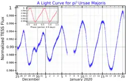 Pi1 Ursae Majoris (Pi1 UMa, π¹ Ursae Majoris, π¹ UMa) is a yellow G-type main sequence dwarf with a mean apparent magnitude of +5.63. It is approximately 46.8 light years from Earth,[1] and is a relatively young star with an age of about 200 million years.[11] It is classified as a BY Draconis type variable star and its brightness varies by 0.08 magnitudes. In 1986, it became the first solar-type star to have the emission from an X-ray flare observed.[14] Based upon its space velocity components, this star is a member of the Ursa Major moving group of stars that share a common motion through space.[7][10]