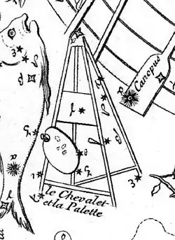 The French astronomer Abbé Nicolas-Louis de Lacaille first described Pictor as le Chevalet et la Palette (the easel and palette) in 1756,[5] after observing and cataloguing 10,000 southern stars during a two-year stay at the Cape of Good Hope.[b] He devised 14 new constellations in uncharted regions of the Southern Celestial Hemisphere not visible from Europe. All but one honored instruments that symbolised the Age of Enlightenment.[7] He gave these constellations Bayer designations, including ten stars in Pictor now named Alpha to Nu Pictoris.[c] He labelled the constellation Equuleus Pictorius on his 1763 chart,[8] the word "Equuleus" meaning small horse, or easel—perhaps from an old custom among artists of carrying a canvas on a donkey.[9] The German astronomer Johann Bode called it Pluteum Pictoris. The name was shortened to its current form in 1845 by the English astronomer Francis Baily on the suggestion of his countryman Sir John Herschel.[5]