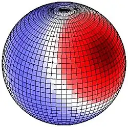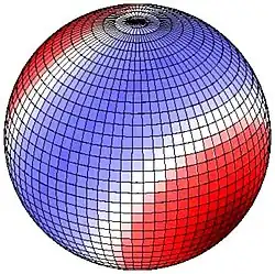 ![]() B. This view shows same potential from 180° from view A. Viewed from above the Northern Hemisphere. Red up, blue down. |