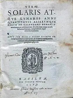 - ↑ This entry (in a rare-books catalogue) suggests that a similar treatise was presented to Pope Pius IV in 1550, but "never published". On the other hand, Pitati's Compendium (next item described in the main article) contained material bearing on calendar reform and was published in more than one edition, it was said by J D North (1983, cited below) to have been written 1539; the sources appear to show some uncertainty or inconsistency about identifying versions of Pitati's writings.