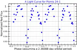 Pismis 24-1 is actually a shallow eclipsing binary with a period of 2.4 days. It is presumed to be the NE component which produces the eclipses, but the separate light curves for the components have not been resolved. The light curve is symmetrical, indicating a near circular orbit, and the two eclipsing stars have very similar masses and temperatures.[4]