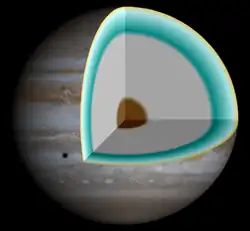 Every planet began its existence in an entirely fluid state; in early formation, the denser, heavier materials sank to the centre, leaving the lighter materials near the surface. Each therefore has a differentiated interior consisting of a dense planetary core surrounded by a mantle that either is or was a fluid. The terrestrial planets' mantles are sealed within hard crusts,[111] but in the giant planets the mantle simply blends into the upper cloud layers. The terrestrial planets have cores of elements such as iron and nickel and mantles of silicates. Jupiter and Saturn are believed to have cores of rock and metal surrounded by mantles of metallic hydrogen.[112] Uranus and Neptune, which are smaller, have rocky cores surrounded by mantles of water, ammonia, methane, and other ices.[113] The fluid action within these planets' cores creates a geodynamo that generates a magnetic field.[111] Similar differentiation processes are believed to have occurred on some of the large moons and dwarf planets,[32] though the process may not always have been completed: Ceres, Callisto, and Titan appear to be incompletely differentiated.[114][115] The asteroid Vesta, though not a dwarf planet because it was battered by impacts out of roundness, has a differentiated interior[116] similar to that of Venus, Earth, and Mars.[109]