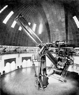 The 30 cm Schrodeder telescope was used to take the spectrum of stars photographically, and the observatory became known for its work on stellar spectrographs.[11] By 1892, they published a list of 52 photographic-based radial velocities from spectroscopy.[12] However, with this they ran out of stars that could be observed with photographic spectroscopy using the 30 cm (12 inch) Schroder.[12] A bigger telescope would be needed to expand this area of study.[12]