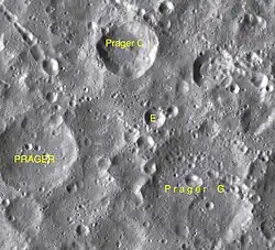 By convention these features are identified on lunar maps by placing the letter on the side of the crater midpoint that is closest to Prager.