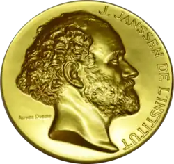 | Reward(s) | A golden medallion with an embossed image of Jules Janssen facing right in profile. To the right of his face is the text "J. JANSSEN DE L’INSTITUT". To the left is the engraver’s name (ALPHÉE DUBOIS) in smaller characters. Reverse : a crown of olive branches and stars; PRIX J.JANSSEN on the top; the laureate’s name and the year in the middle. |