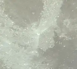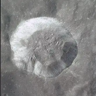 The crater has a notable ray system that extends for a distance of over 600 kilometers. The rays display an asymmetry of form, with the most prominent being rays to the northwest, north-northeast, and northeast. There is an arc with no ejecta to the southwest. These features suggest an impact at a low angle. The rays indicate the crater is part of the Copernican System.[3]