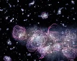 It is thought that the early universe began with a nearly uniform distribution (each particle an equal distance from the next) of matter and dark matter. The dark matter then began to clump together under gravitational attraction due to the initial density perturbation spectrum caused by quantum fluctuations.[1] This derives from Heisenberg's uncertainty principle which shows that there can be tiny temporary changes in the amount of energy in empty space. Particle/antiparticle pairs can form from this energy through mass–energy equivalence, and gravitational pull causes other nearby particles to move towards it, disturbing the even distribution and creating a centre of gravity, pulling nearby particles closer. When this happens at the universe's present size it is negligible, but the state of these tiny fluctuations as the universe began expanding from a single point left an impression which scaled up as the universe expanded, resulting in large areas of increased density. The gravity of these denser clumps of dark matter then caused nearby matter to start falling into the denser region.[2] This sort of process was reportedly observed and analysed by Nilsson et al. in 2006.[3][4] This resulted in the formation of clouds of gas, predominantly hydrogen, and the first stars began to form within these clouds. These clouds of gas and early stars, many times smaller than our galaxy, were the first protogalaxies.[5]
