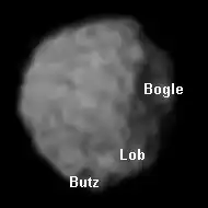 ![]() Puck as imaged by Voyager 2 in January 1986. The image is centered on Puck's south pole. Despite the low resolution, several craters have been identified, including Bogle on the upper right | |