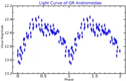 QR Andromedae (often abbreviated to QR And) is an eclipsing binary star in the constellation Andromeda. Its maximum apparent visual magnitude is 12.16, but its light curve shows clearly eclipsing events where its brightness can drop to a magnitude of 13.07.[6] This leads to its classification as an Algol variable star.[3]