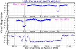![]() Visual band light curves for QS Virginis, adapted from O’Donoghue et al. (2003).[1] The lowest plot shows two pre-eclipse dips. | |