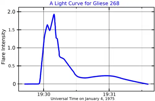 ![]() A blue light light curve of a flare on Gliese 269. The intensity scale is relative to the star's quiescent brightness. Adapted from Pettersen (1975)[1] | |
