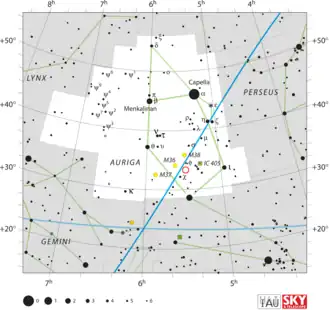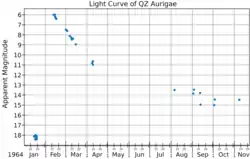 QZ Aurigae, also known as Nova Aurigae 1964, was a nova which occurred in the constellation Auriga during 1964. It was discovered by Nicholas Sanduleak on an objective prism photographic plate taken at the Warner and Swasey Observatory on 4 November 1964.[5] Examination of pre-discovery plates from Sonneberg Observatory showed that the eruption occurred in early February 1964, and it had a photographic magnitude of 6.0 on 14 February 1964. Its brightness declined in images taken after the 14th, suggesting that its peak brightness was above 6.0.[6] It was probably visible to the naked eye for a short time.