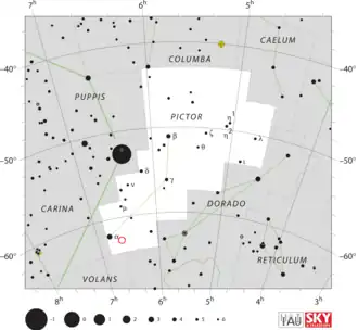 RR Pictoris, also known as Nova Pictoris 1925, is a cataclysmic variable star system that flared up as a nova that lit up in the constellation Pictor in 1925. It was discovered by South African amateur astronomer R. Watson who lived in Beaufort West. At 05:50 AM on 25 May 1925, Mr. Watson was walking to work and noticed a star that he did not recognize in line with the stars α Crucis and β Carinae. He consulted his copy of Norton's Star Atlas, and realized that the unfamiliar star was a nova. Fortuitously, Mr. Watson was employed as a telegraph operator, and he promptly sent a telegram describing his discovery to the Royal Observatory at Cape Town. This quick reporting of the event allowed southern observatories to obtain spectra of the nova before it had reached maximum brightness.[3][4]