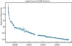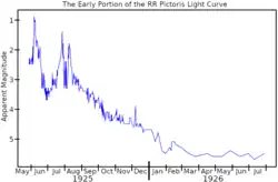 At the time of its discovery, RR Pictoris had an apparent magnitude of 2.3. It continued to brighten to magnitude 1.2, which it reached on 9 June 1925. It dimmed to magnitude 4 by 4 July, but brightened again to 1.9 on 9 August. Six months after its peak brightness, RR Pictoris faded to be invisible to the unaided eye, and was magnitude 12.5 by 1975.[5] RR Pictoris is classified as a slow nova[6] and its light curve exhibits positive superhumps, meaning superhumps with a period a few percent (8.6% in this case) longer than the star system's orbital period.[7]