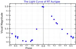 RT Aurigae is an F to G type Classical Cepheid variable which varies from magnitude +5.00 to +5.82 with a period of 3.728309 days.[7] The variability was discovered in 1905, by an English schoolmaster and amateur astronomer, Thomas Hinsley Astbury.[13][14] It was quickly recognised as a member of the class of Cepheid variables, but their nature was not understood at that time. Radial velocity changes were detected corresponding to the brightness variations, but the idea that these were caused by stellar pulsations and temperature changes was largely dismissed in favour of orbital motions of a binary star.[15] More accurate observations eventually proved beyond doubt that the brightness variations were caused by pulsations in the atmospheres of the stars, with the stars being smallest and hottest near maximum brightness.[16]