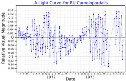RU Cam remained a somewhat unusual W Virginis variable until 1964, when the relatively regular pulsation of about 1 magnitude almost entirely stopped.[12] Since then the pulsations have varied from cycle to cycle, with amplitudes changing from several tenths of a magnitude to almost zero.[13] The light curve has a more sinusoidal shape than when it was pulsating at full amplitude and the period changes erratically between 17.4 and 26.6 days.[14]
