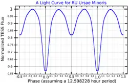 RU Ursae Minoris is a binary star system in the constellation Ursa Minor. Its apparent magnitude ranges from 10 to 10.66 over 0.52 days as one star passes in front of the other relative to observers on Earth.[3] Its component stars were calculated to be a primary star of spectral type F0IV/V and a secondary of spectral type K5V, both slightly more luminous than their spectral types indicate. The system is semidetached, as the secondary star is filling its Roche lobe and transferring matter to the primary.[6] The primary is between 2.2 and 2.3 times as massive as the Sun, with 1.8 times its radius and around 8 times its luminosity. The secondary has around 0.72 times the Sun's mass, 1.1 times its radius and between 0.58 and 0.86 times its luminosity.[7]