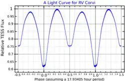 RV Corvi is an eclipsing binary star system in the southern constellation of Corvus. The brightness of the pair regularly ranges in apparent visual magnitude from 8.6 down to 9.16 over a period 18 hours,[4] even the brightest of which is too faint to be visible to the naked eye. The system is located at a distance of approximately 690 light-years from the Sun based on parallax measurements, and is drifting further away with a radial velocity of ~19 km/s.[8]