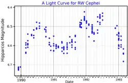 The magnitude range of RW Cephei was given as 8.2–8.8 using photographic plates in the initial report,[22] while later studies found the photographic range to be from 8.6–10.7,[35][5] noting that maxima and minima cannot be derived with any certainty.[35] Other authors estimate an amplitude of only around 0.5 magnitudes.[36] Modern estimates put the range of variability from 6.0 to 7.6 in the V-band.[3]