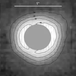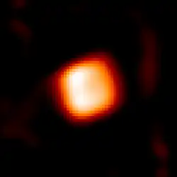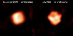 In December of 2022, the star was reported by two astronomers to be going through a "great dimming", reaching a fainter than usual magnitude of 7.6.[16][28][29] It was speculated to be caused by short periods of enhanced mass loss leading to the condensation of dust that partially obscures the stellar photosphere.[8] This was later confirmed by observations with the CHARA array, revealing a dark patch on the western side of the star suggested to be a dust cloud released in a recent surface mass ejection.[13] An unusually bright maximum attained in 2019 right before the dimming was suspected to be caused by an energetic convective upwelling of hot gas, later being expelled and cooling into a dust cloud obscuring the star.[13] The event is compared to the great dimming of Betelgeuse that happened in late 2019[8][13][16][28][29] and the dimming events seen in the historical light curve of VY Canis Majoris.[8][13]