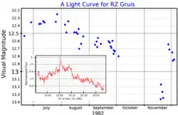 ![]() A visual band light curve for RZ Gruis. The main plot shows the long term variation, and the inset plot shows the short term variability. Adapted from Sickland et al. (1984)[1] | |