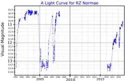 ![]() A visual band light curve for RZ Normae, plotted from All Sky Automated Survey and ASAS-SN data[1][2] | |