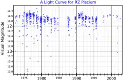 RZ Piscium (or RZ Psc) is a UX Orionis type variable star[7] 608 light-years (186 pc) away, in the constellation Pisces.[2] Over the years, the star has been found to brighten and dim erratically, dimming by as much as a tenth of its usual luminosity.[11] RZ Piscium has been found to emit large amounts of infrared radiation,[9] suggesting the presence of a substantial mass of gas and dust orbiting the star, possibly from a "disrupted planet".[6][12]