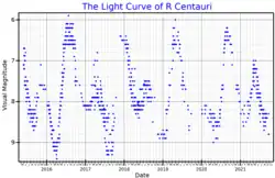 Benjamin Apthorp Gould discovered R Centauri, in 1871.[12] The star is a Mira variable and its brightness varies from magnitude +5.2 to +11.5 with a period of about 500 days. It used to have an unusual double-peaked light curve, but by 2001 this had reverted to an almost normal single-peaked curve. Prior to 1950 the period was about 550 days, but since then has decreased to about 500 days. A 2016 analysis of ASAS data derived a period of 498.84 days.[13]