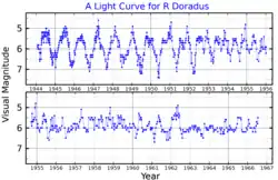 It is classified as a semiregular variable star of type SRb, indicating giants with slow poorly-defined variations, often alternating between periodic and irregular brightness changes.[5] Some studies show it alternating between periods of about 175 and 332 days, and a period of 117.3 days has also been identified.[13] It has been likened to a Mira variable when its variations are relatively regular, although its amplitude of only 1.5 magnitudes is smaller than Mira variables.[14] The star was discovered to be variable in 1874 by Benjamin Gould, and received the variable-star designation R Doradus.[2]