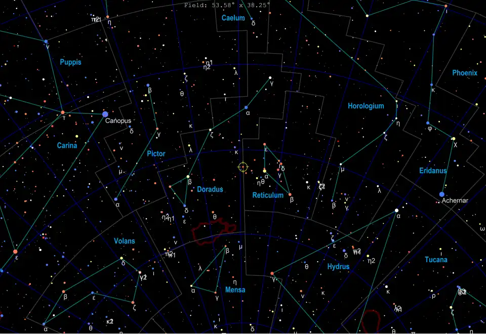 | R Doradus figures almost at the western limit of Dorado, next to Reticulum (map to be held, as standard, upwards, with south horizon in front of viewer). Like Alpha Reticuli, which outshines it, it is a little south of a line between the bright stars Canopus and Achernar, as is the narrow kite-shaped asterism of Reticulum. |