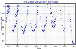 R Fornacis was discovered to be variable in 1896 after it had been observed with a different brightness to that shown in the Cordoba Durchmusterung.[10] In 1983, an unusually deep minimum was observed, and later correlated with an asymmetric shell of material ejected from the surface of the star.[4] Unconfirmed visual estimates of the unusual minimum give a magnitude of 14.0, while infrared observations confirm the unusual variation.[9]