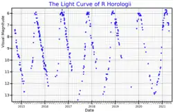 R Horologii is a red giant star approximately 760 light-years away in the southern constellation of Horologium.[13] It is a Mira variable with a period of 404.83 days,[14] ranging from apparent magnitude 4.7 to 14.3—one of the largest ranges in brightness known of stars in the night sky visible to the unaided eye.[2] The star is losing mass at the rate of 5.9×10−7 M☉·y−1.[10]