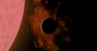 In 2009 Wiesemeyer et al.[5] proposed that quasi-periodic fluctuations observed for the star R Leonis may be due to the presence of an evaporating substellar companion, probably an extrasolar planet. They have inferred a putative mass for the orbiting body of twice the mass of Jupiter, orbital period of 5.2 years and likely orbital separation of 2.7 astronomical units. If confirmed such a planetary object could likely be an evaporating planet, with a long comet-like trail as hinted by intense SiO maser emissions.